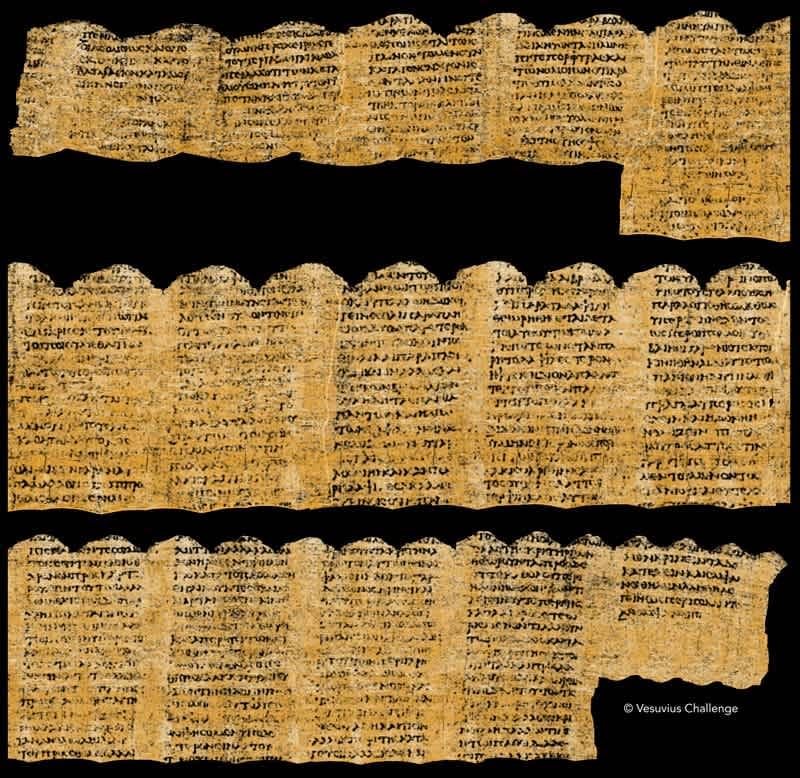 Ancient manuscript fragments with dense text columns, illustrating materials restored through AI scanning techniques. Source: nature.com
