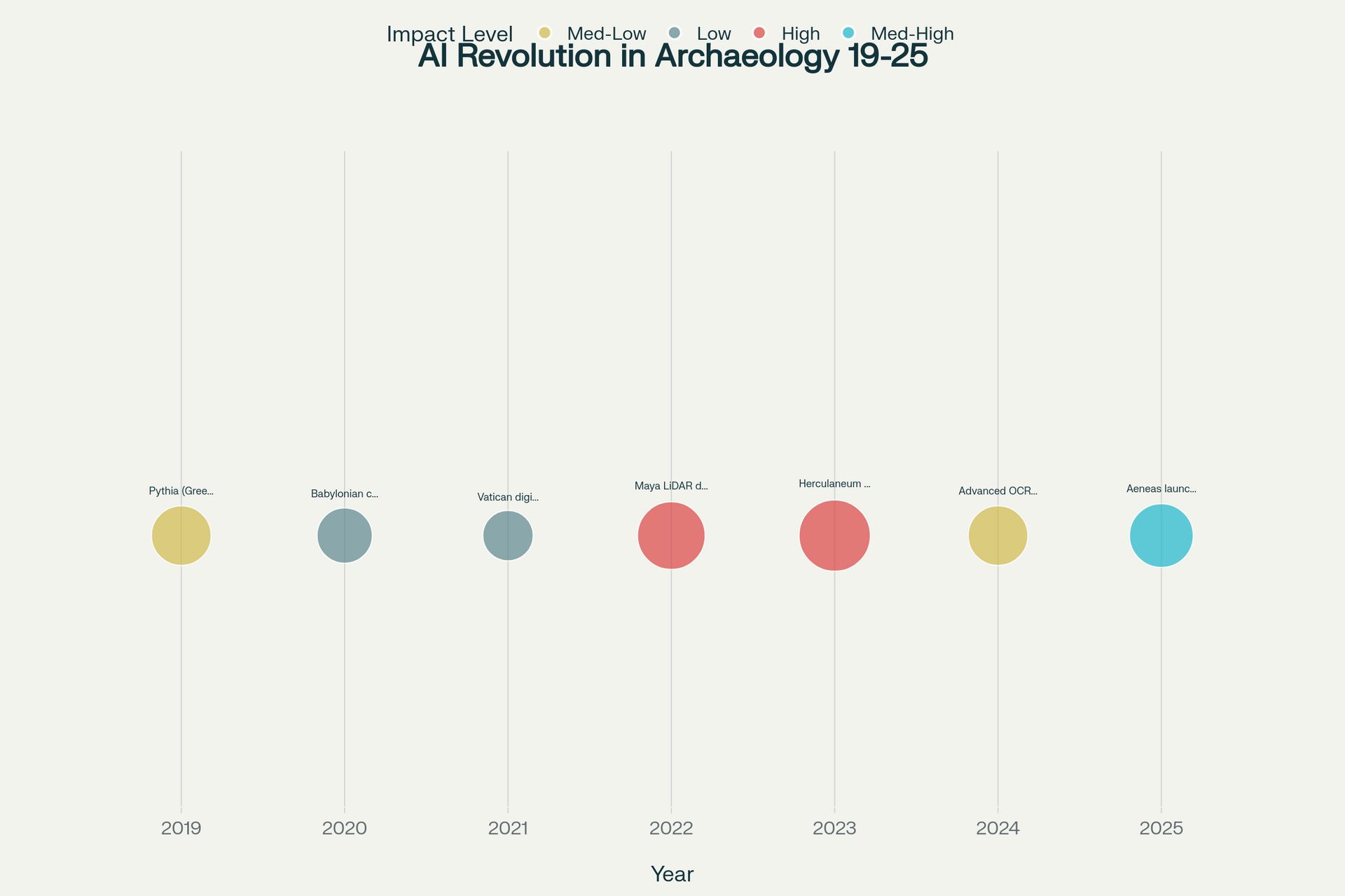 Timeline showing the rapid evolution of AI applications in archaeology from 2019 to 2025