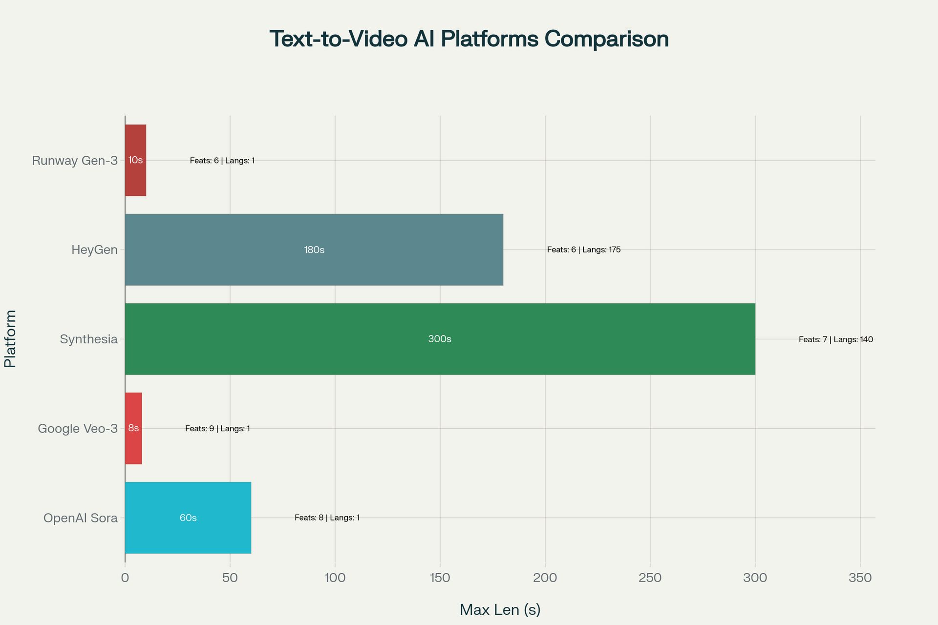 Comparison of major text-to-video AI platforms showing maximum video length capabilities